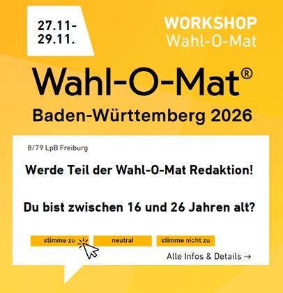 Ab sofort können sich junge Menschen, die am Wahltag zwischen 16 und 26 Jahre alt sind, für den Workshop bewerben. Der Workshop findet von Donnerstag, 27.11. bis Samstag, 29.11.2025 in Freiburg statt.